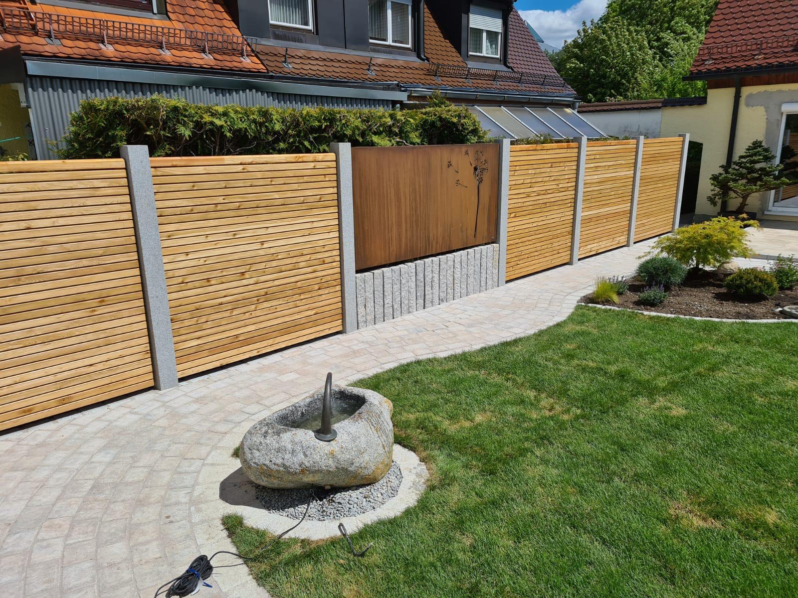 Einfassungen, Feinsteinzeug, Betonpflaster, Mauer, Sichtschutzzaun, Rollrasen und die Vorbereitung der Pflanzflächen